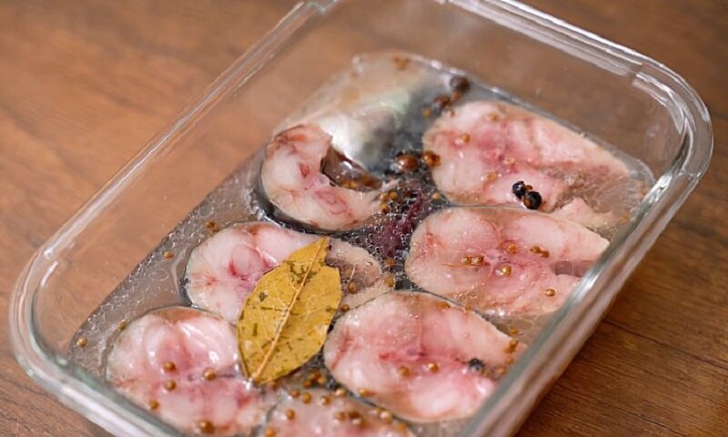3. Поместить куски скумбрии в контейнер и залить маринадом так, чтобы они были полностью покрыты. Закрыть контейнер и оставить на столе на 3 часа, после чего переместить в холодильник на ночь.