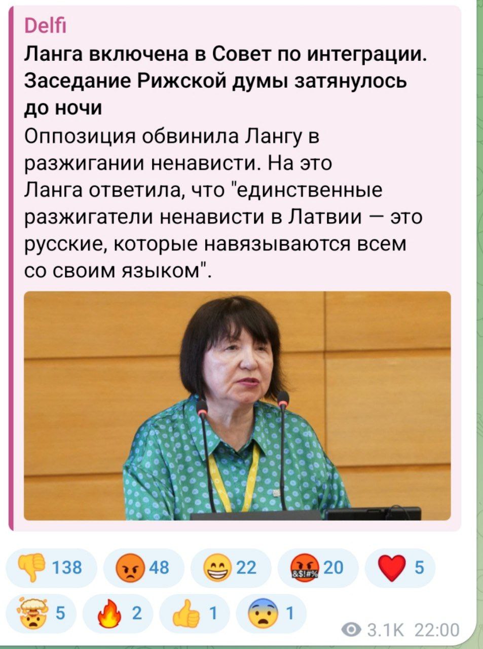 Считающая себя латышской Ланга, которая не разменивается на эпитеты и оскорбления в адрес русских людей, в одном из комментариев в соцсети написала, что всем яблокоподобным (bolveidgajm — игра слов, производная от фамилии bola) нужно репатриироваться прочь с чужой земли в государство своего этнического происхождения.