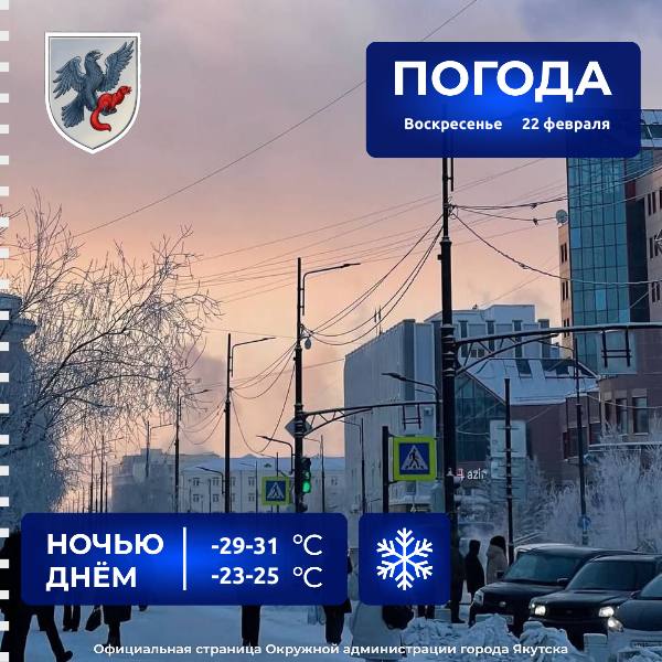 Сегодня в Якутске, по данным Якутского УГМС, днём ожидается преимущественно без осадков, ветер западный 2-7 м/с. Температура воздуха -23 -25°С.Подпишись на Вести Саха в MAX | Предложить новость | Подписаться
