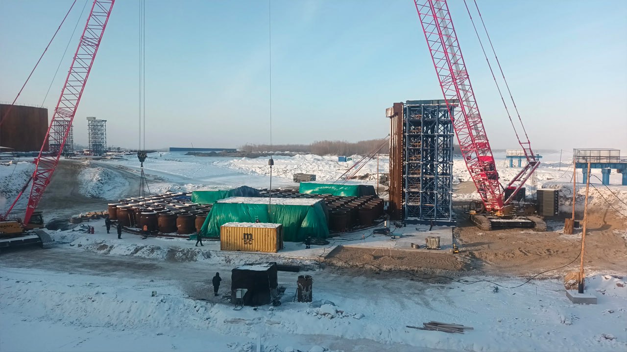 На строительстве Ленского моста приступили к монтажу стен коффердама для главного пилона.