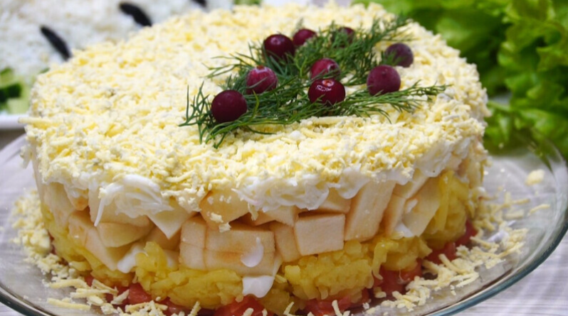 После картофеля добавляют кубики яблок, сбрызнутые лимонным соком, чтобы они не потемнели. Затем следует слой яичных белков и, наконец, желтков. Блюдо можно украсить по вашему желанию, например, укропом и клюквой.