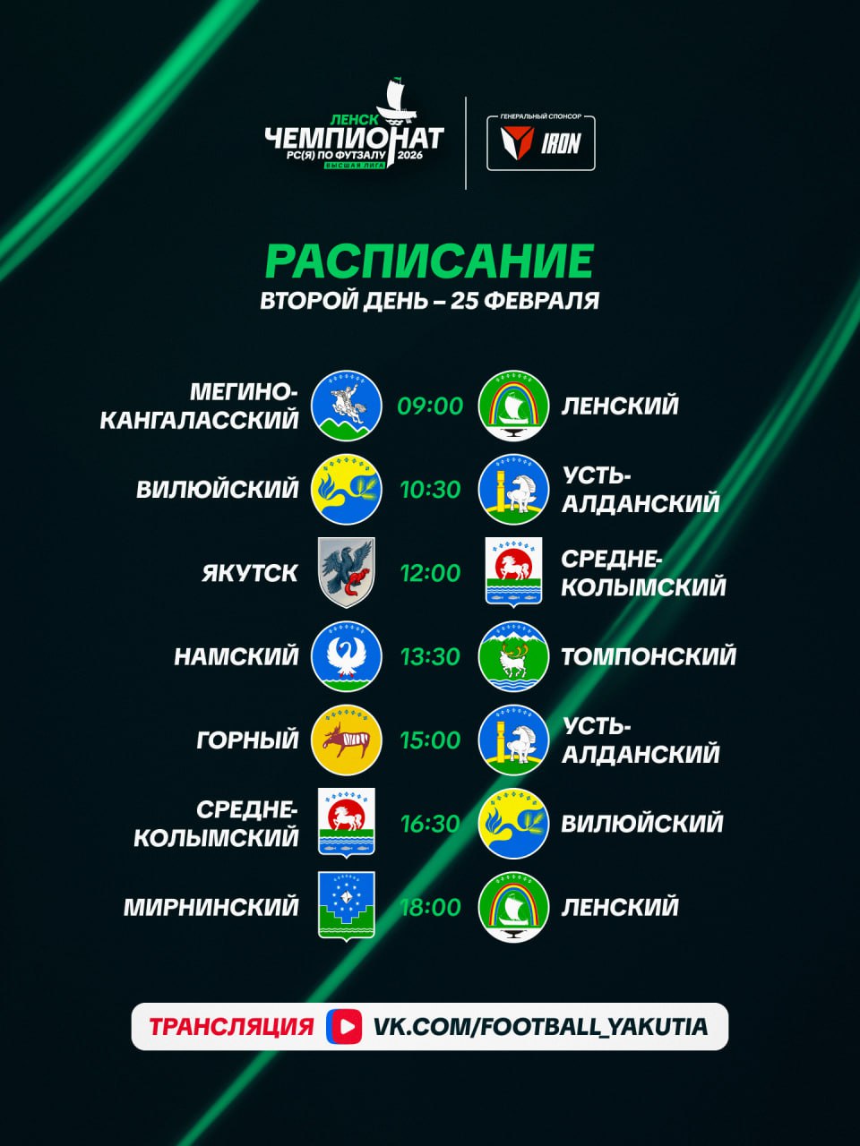 Напоминаем расписание второго игрового дня Чемпионата РС(Я) по футзалу 2026