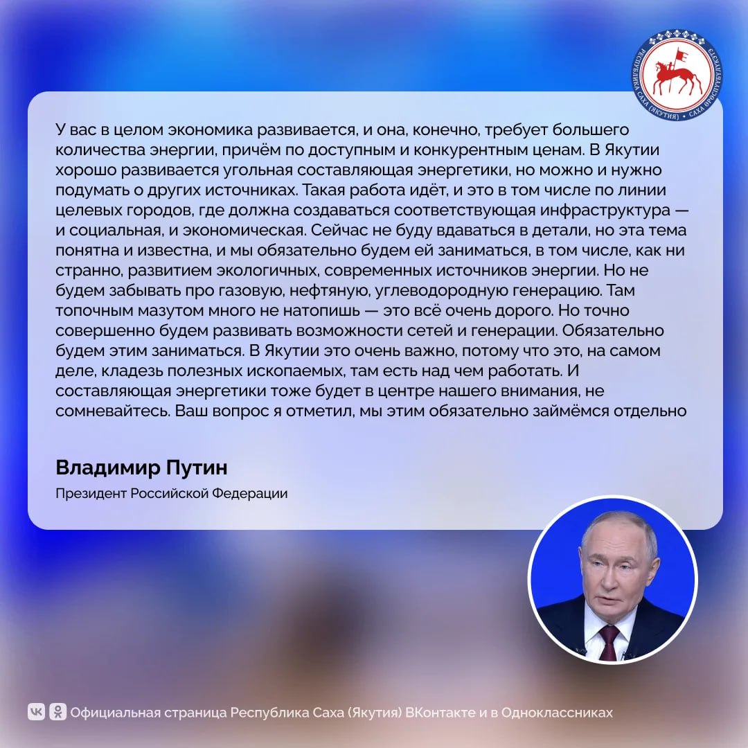 Отвечая на вопрос журналиста, Владимир Путин подчеркнул, что растущая экономика Якутии требует увеличения объемов энергоснабжения по доступным и конкурентным ценам. Он отметил, что энергетика имеет ключевое значение для Севера и для Якутии.