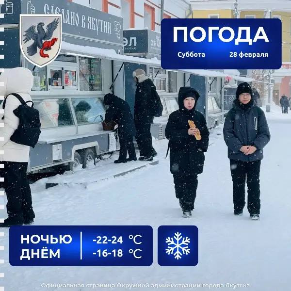 Сегодня в Якутске, по данным Якутского УГМС, ожидается небольшой снег, ветер юго-восточный 2-5 м/с. Температура воздуха -16 -18°С.Подпишись на Вести Саха в MAX | Предложить новость | Подписаться