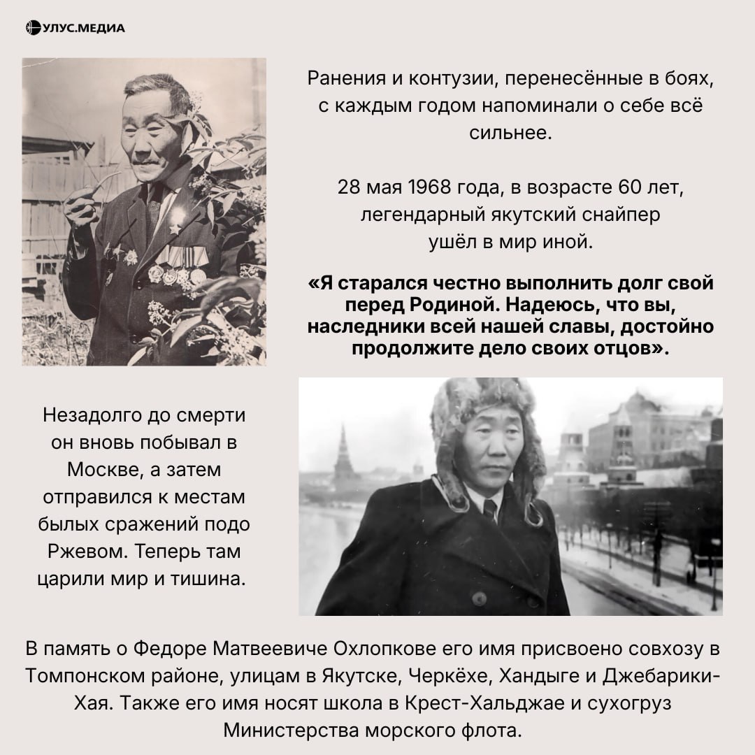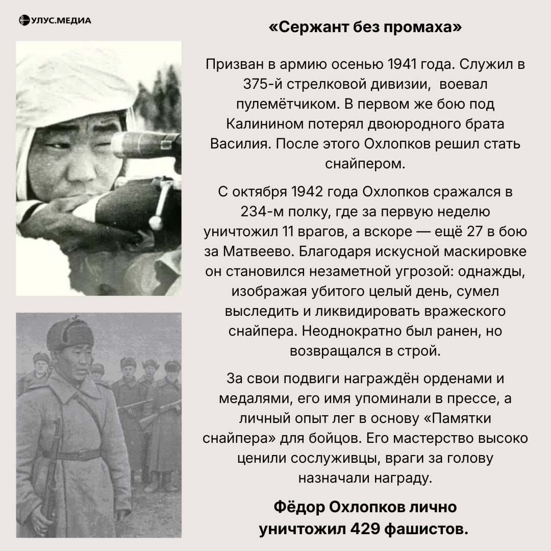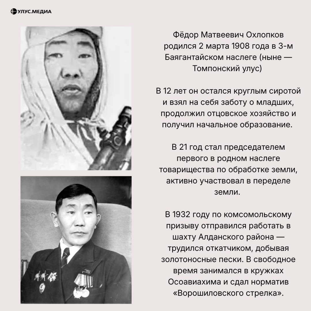 Сегодня, 2 марта, исполняется 118 лет со дня рождения Фёдора Матвеевича Охлопкова — легендарного якутского снайпера, чья судьба стала примером мужества и силы духа для целого поколения.