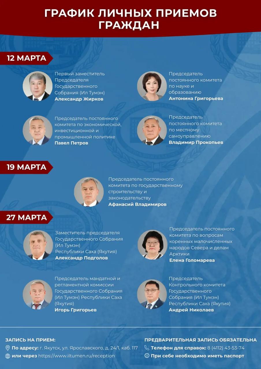 Распоряжением Председателя Государственного Собрания (Ил Тумэн) Республики Саха (Якутия) от 10.12.2025 г. № 166 утвержден график личного приема граждан в Государственном Собрании (Ил Тумэн) Республики Саха (Якутия) на период весенней сессии 2026 года.