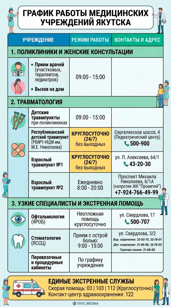 Министерство здравоохранения Якутии опубликовало график работы медицинских организаций в предстоящие выходные дни, 8 и 9 марта