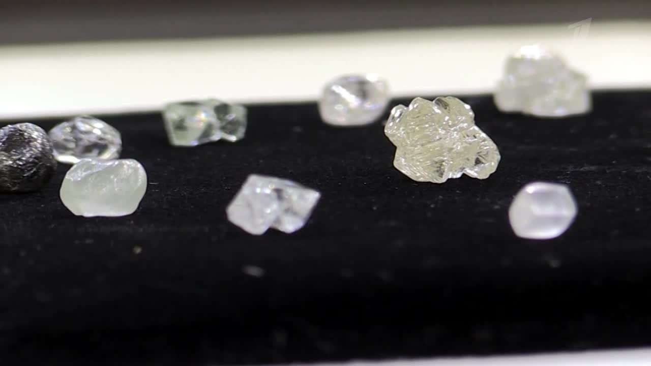 Тут все алмазы уникальные, необычной формы и цветности: прозрачные, желтые, зеленоватые, аметистовые. Всего 238 камней, и все добыты в Якутии. Рядом с алмазами ювелирного качества черные кубы — технические, камни-труженики.
