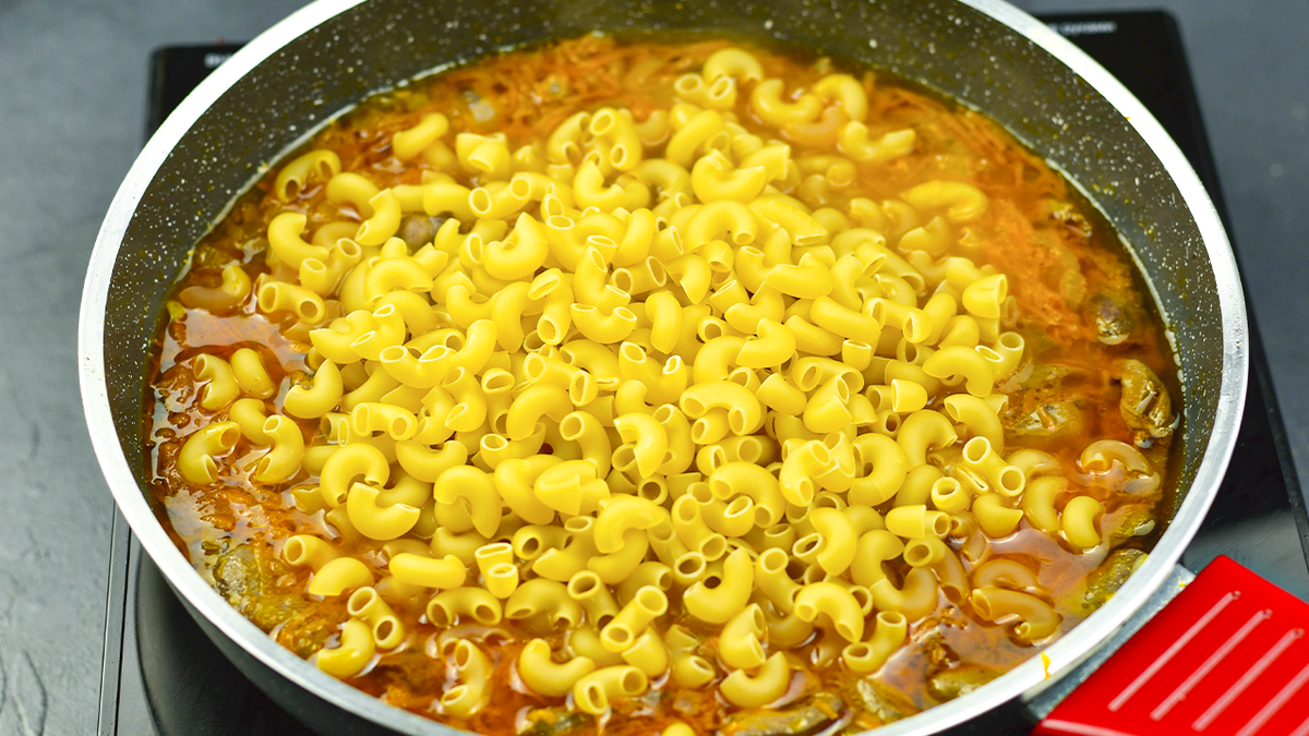 5. Добавьте макароны и остальную воду (600 мл), чтобы они были покрыты. Готовьте до полной готовности макарон.