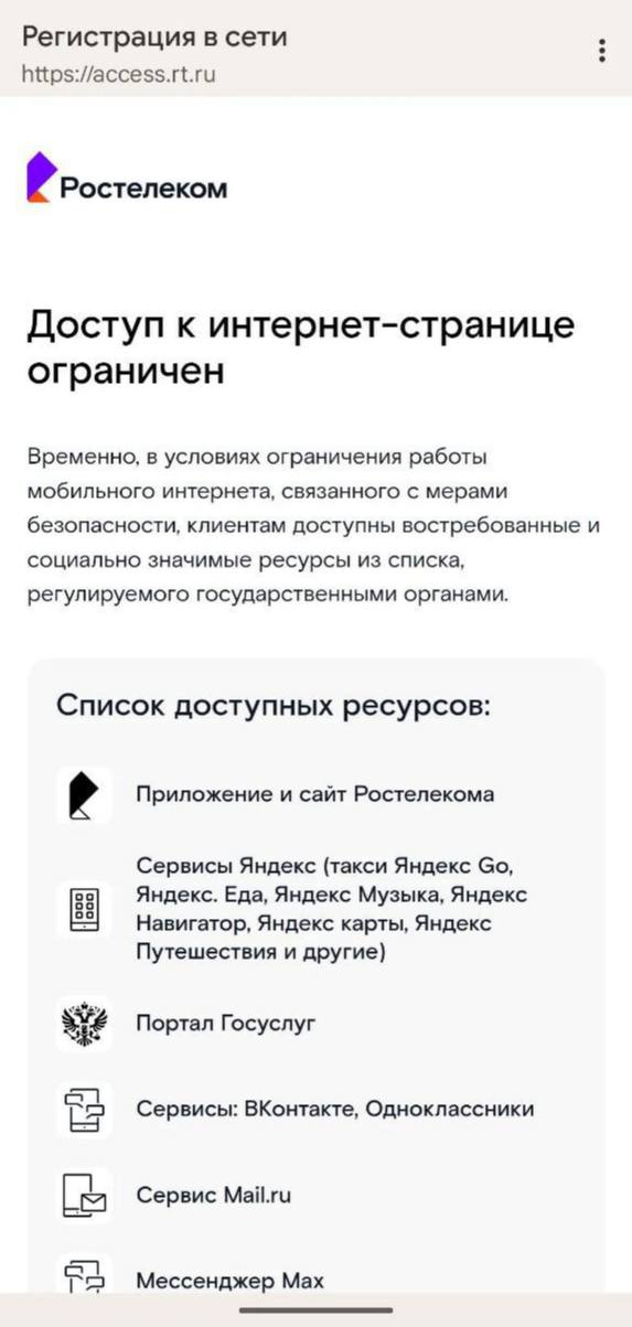 С белыми списками работают только сервисы VK и Яндекса, Госуслуги и госмессенджер Max. @bankrollo