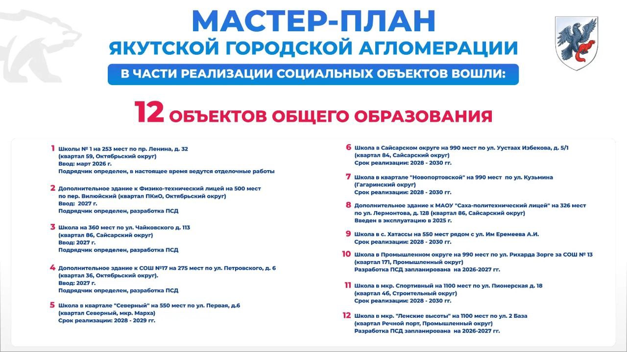 Из общего перечня, дополнительное здание СПЛ построено в 2025 г. Ближайшие по срокам реализации: школа №1 на пр. Ленина (2026 г.); новое здание ФТЛ по Вилюйскому тр. (2027 г.); школа по ул. Чайковского, 113 (2027 г. ); пристрой к СОШ №17 (2027 г.); детсад в мкр. Северный (2027 гг.); детсад ул. Новокарьерная (2027 г.).