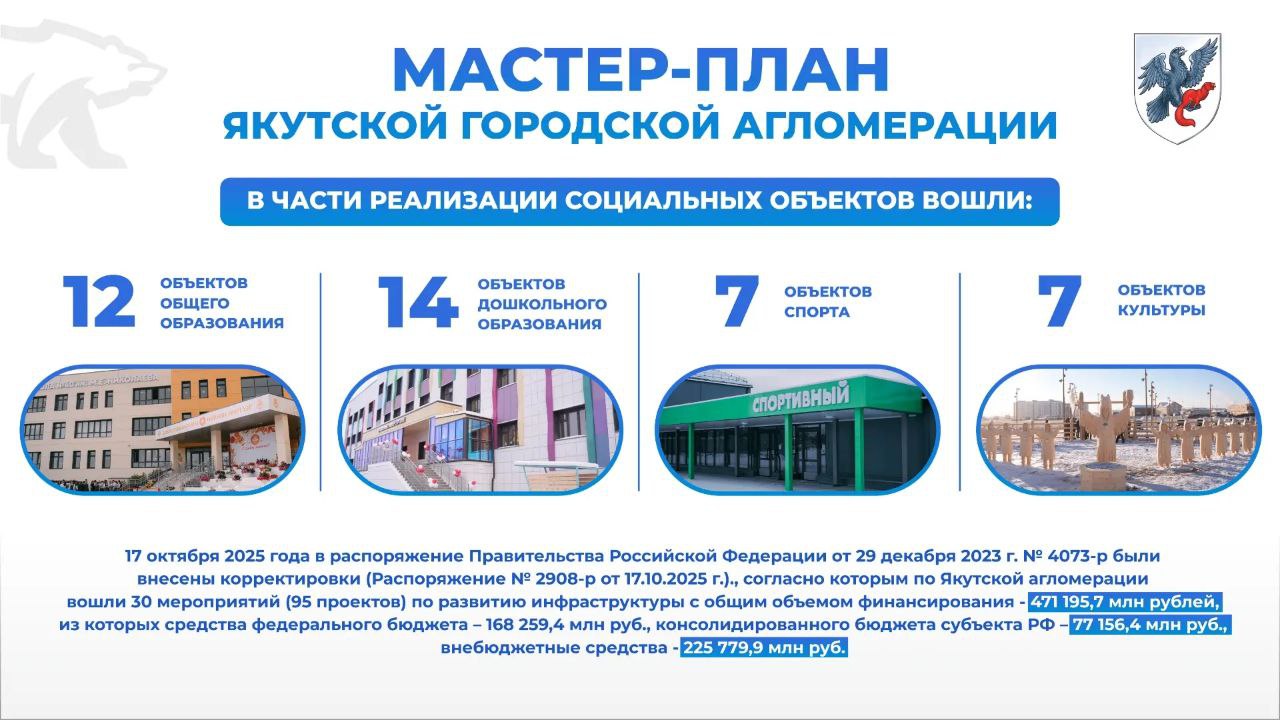 В рамках реализации мастер-плана Якутска до 2030 года, одобренного Президентом России В.В. Путиным, проектов Народной программы партии «Единая Россия» будут построены 12 объектов общего образования (новых школ и пристроев к действующим школам) и 14 детских садов.