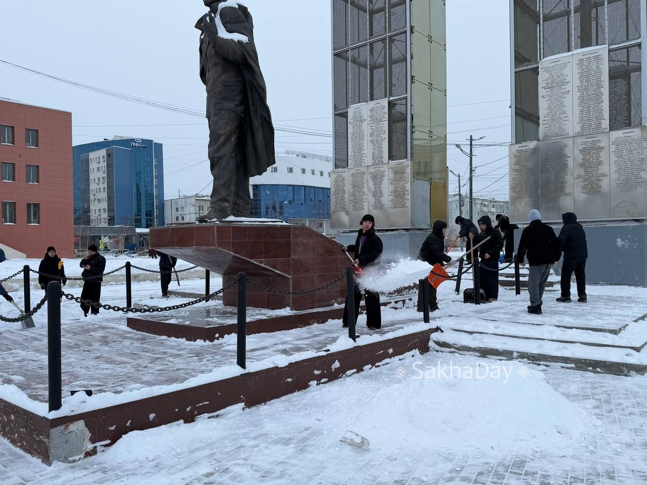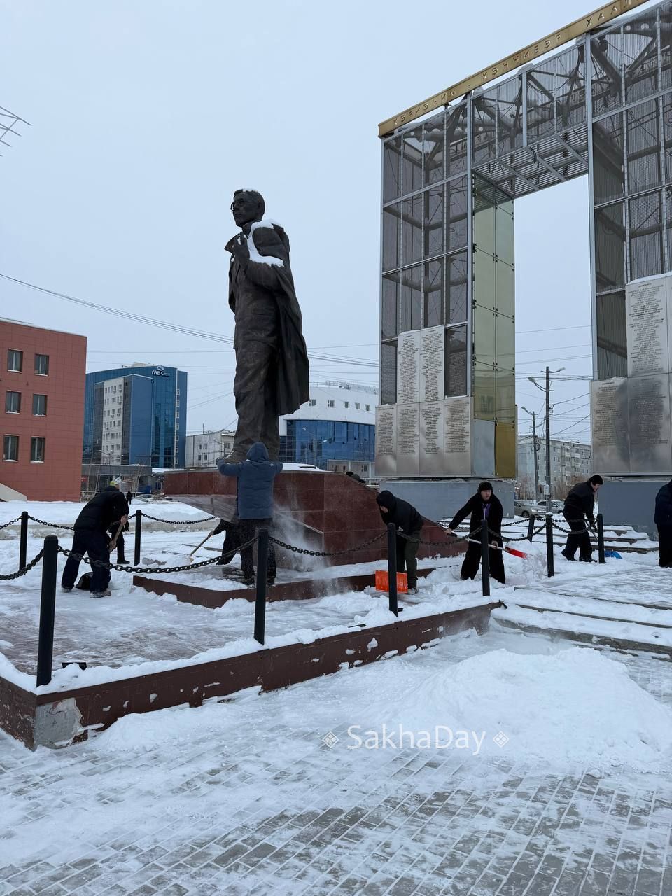Студенты чистят памятник П.А. Ойунского на площади. #дляsakhaday