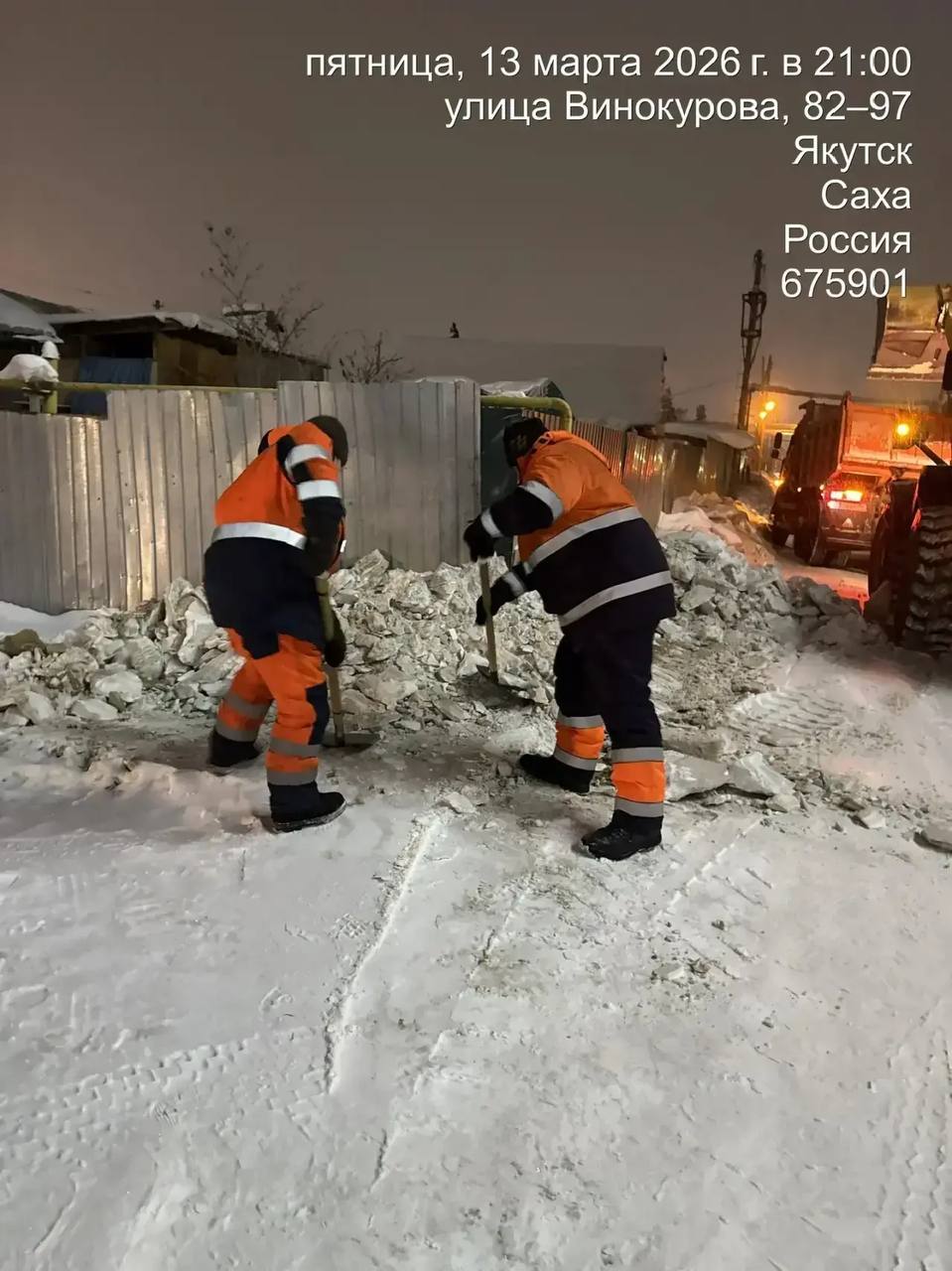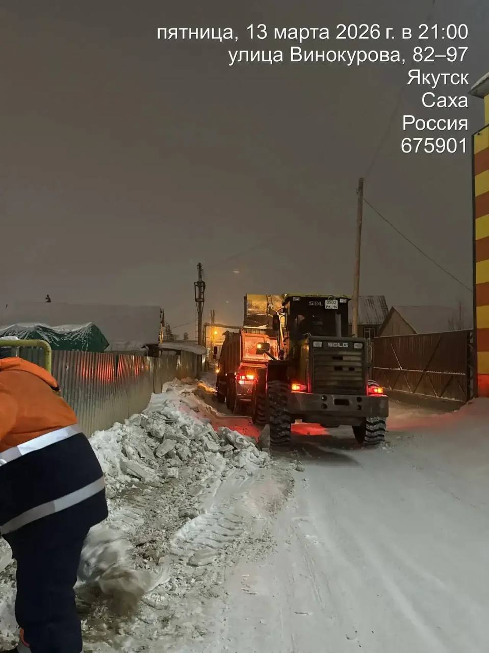 Кадры ночных работ по погрузке снега по ул. Винокурова.