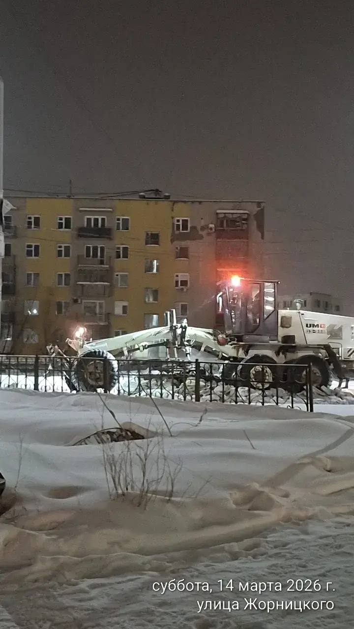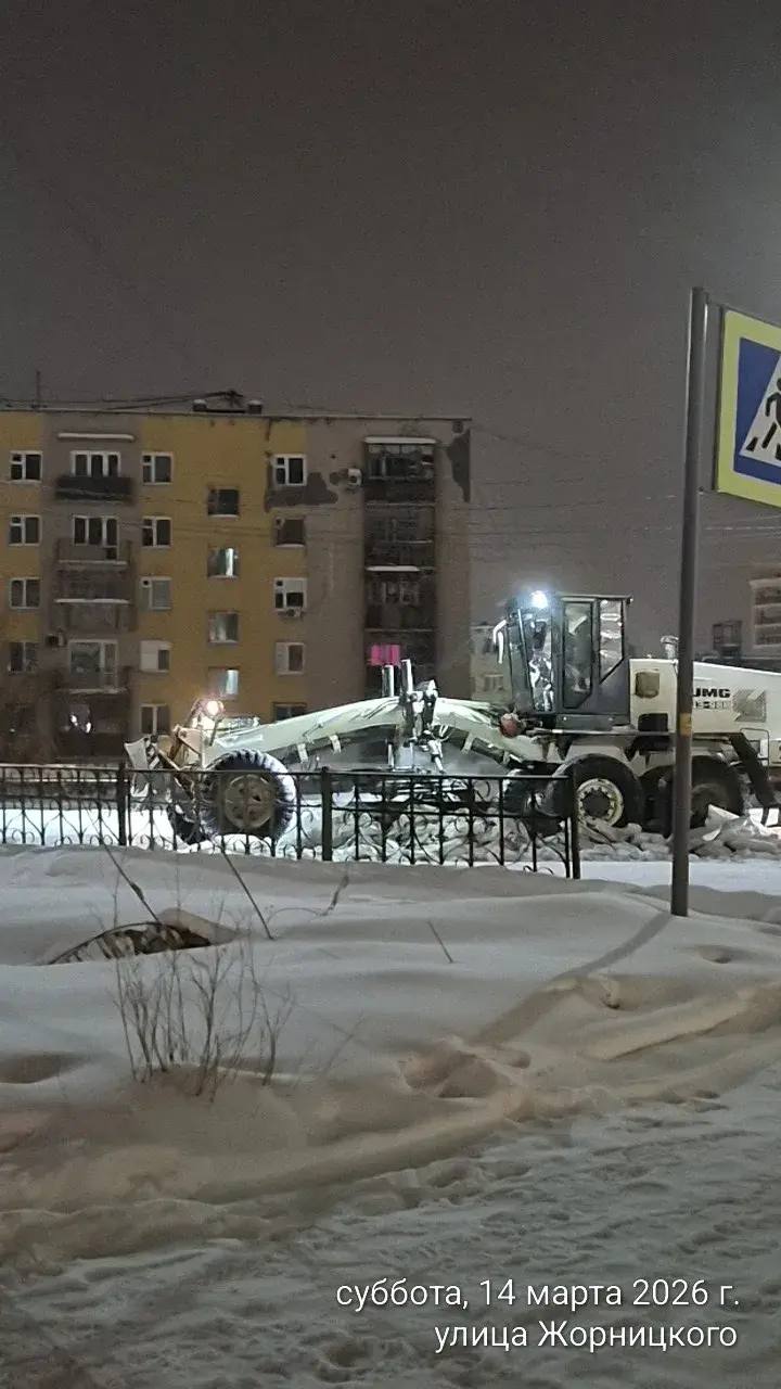 Кадры ночных работ по погрузке снега по пр. Ленина.