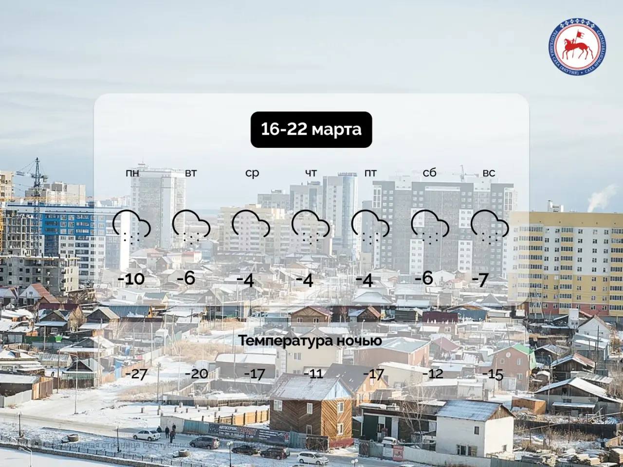 Согласно прогнозу Росгидромет, в период с 16 по 22 марта в столице республики, Якутске, преимущественно облачно.