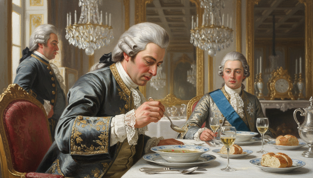 1717 год, Версаль. Русский посол граф Борис Куракин беседует с королем Людовиком XV за обедом. Все шло гладко, пока граф, наклонив тарелку, не заставил немедленно прерваться обед. Французский министр сразу же отворачивается, а дипломатическая атмосфера становится натянутой. Позже Куракин заключит в своем донесении, что "за столом проигрывают больше, чем на поле боя".