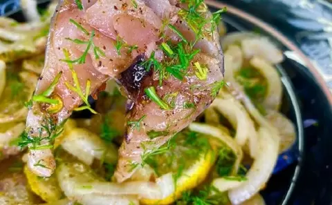 Засолка скумбрии может проходить как в контейнере, так и в обычном полиэтиленовом пакете. В данном случае рассмотрим метод пакетной засолки. Лук нарезать тонкими полукольцами, выложить на дно пакета, добавить лимон, сок, все специи, масло и зелень. Тщательно перемешать.