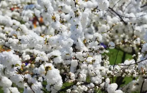 - Вишня войлочная: Комфортный в уходе кустарник, который радует глаз мелкими цветками, меняющими цвет с розового на белый. Он идеально подходит для создания живых изгородей.