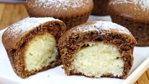 Разогрейте духовку до 180°C. Выложите силиконовые формы в противень, заполните их на дно одной столовой ложкой шоколадного теста, затем положите чайную ложку творожной начинки и закройте еще одним слоем теста. Выпекайте 20-25 минут. Проверьте готовность шпажкой, она должна выйти чистой, а начинка остаться слегка влажной.