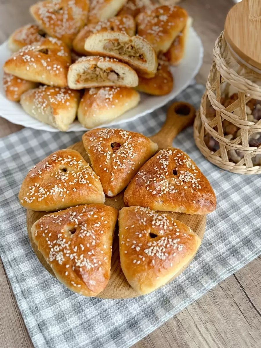 Смешать все ингредиенты, замесить мягкое тесто и оставить его подниматься. Далее разделить на небольшие шарики, раскатать, положить начинку и защипнуть края. После этого дать пирожкам подняться на противне, смазать яичной смесью и посыпать кунжутом. Выпекать до румяной корочки.