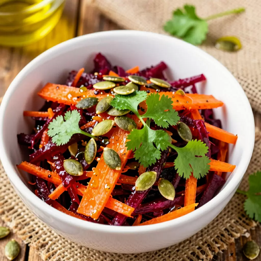 Предлагается экспериментировать с салатом из сырой свеклы, моркови и капусты, дополненного тыквенными семечками и кинзой. Этот салат не просто вкусный — он также насыщен клетчаткой и витаминами. Свекла богата фолиевой кислотой и магнием, что необходимо для нервной системы, в то время как морковь обеспечивает витамином А для поддержки иммунитета.