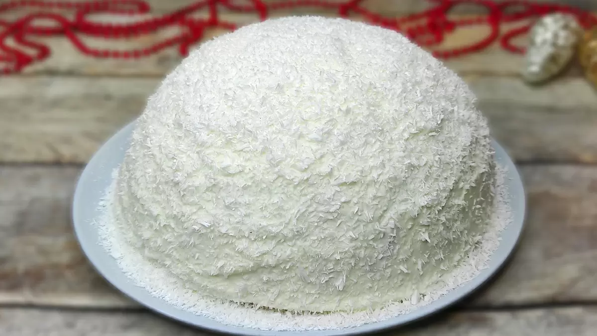 После настаивания торт переворачивается на блюдо, а сверху покрывается взбитыми сливками, смешанными с сгущенным молоком, и посыпается кокосовой стружкой.