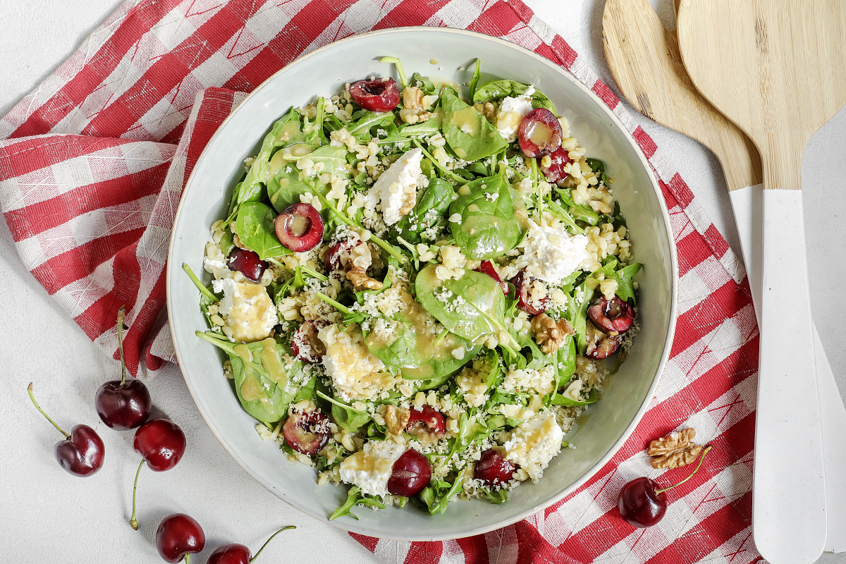 Сочетание сласти черешни и нежности рикотты с хрустящими грецкими орехами создают гармоничную текстуру и вкус. А булгур добавит насыщающего элемента, превращая салат в полноценное блюдо. Заправка из кленового сиропа, дижонской горчицы и лимонного сока придаст характерный пикантный вкус, который станет изюминкой этого летнего угощения.
