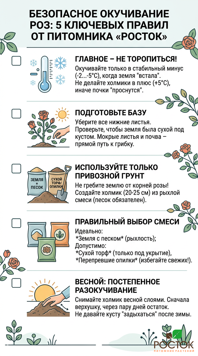 Забудьте о календаре! Настоящая ответственность лежит на градуснике. Не следует окучивать розы, пока температура все еще высока — это может вызвать активацию почек. Если вы уже насыпаете землю на стебли при температуре, скажем, +5°C, то рискуете создать для растения настоящую теплицу, как только температура опустится ниже нуля.