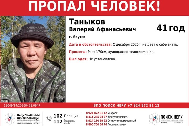 В Якутске разыскивают 41-летнего Таныкова Валерия Афанасьевича, который перестал выходить на связь с декабря прошлого года. Никто из знакомых мужчины не знает о том, где он может быть.