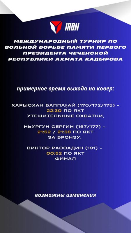 примерное время выхода на ковер (возможны изменения): Харысхан Баппа5ай (170/172/175) - 22:30 по яктутешительные схваткиНьургун Сергин (167/177) -21:52 / 21:58 по яктборьба за бронзуВиктор Рассадин (191) -00:52 по яктфиналПоддержка стримаСБЕР:...