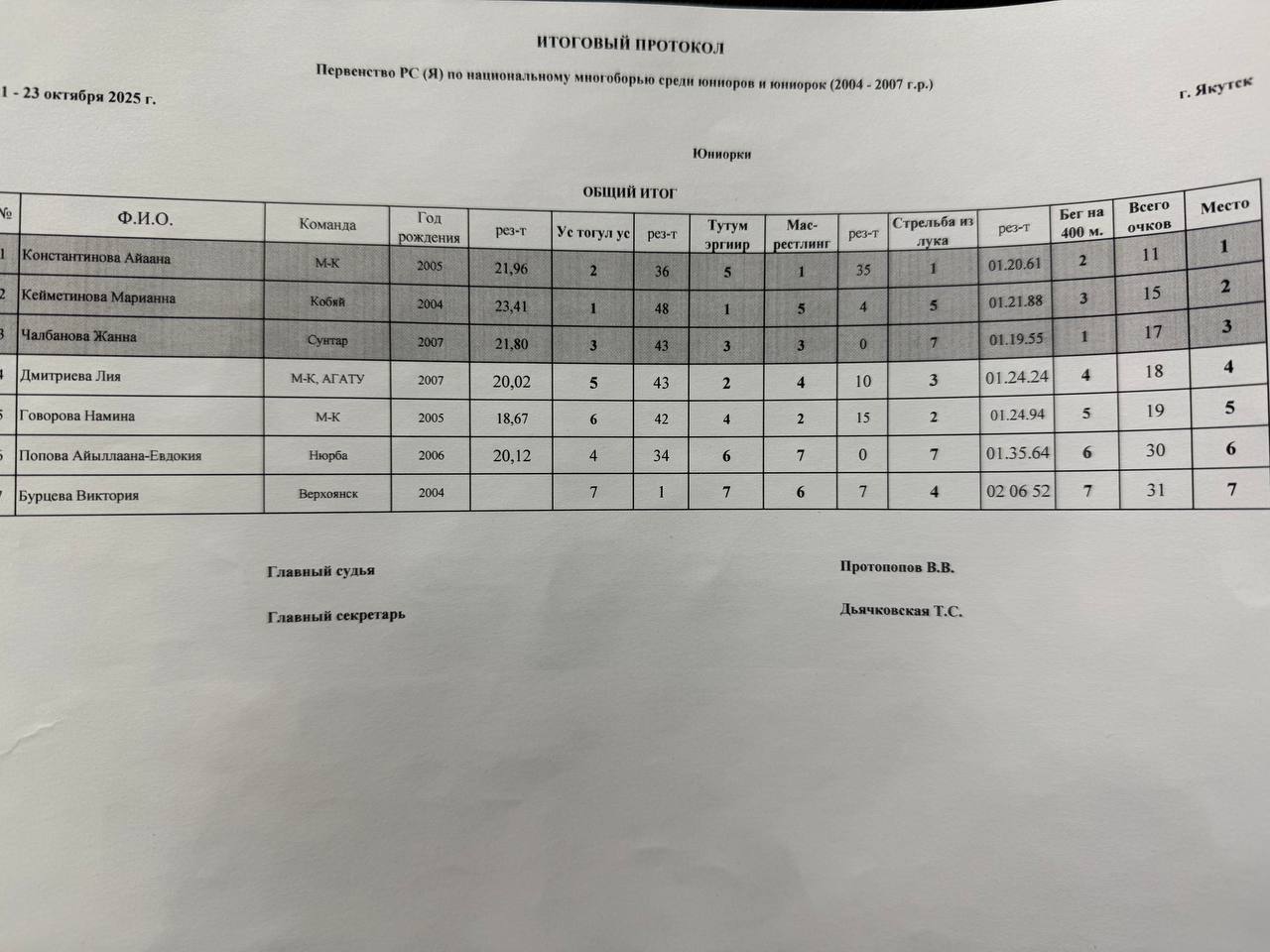 У девушек в общем зачете победу одержала Айаана Константинова. Юная спортсменка первенствовала в двух видах из пяти - мас-рестлинге и стрельбе из лука, а также дважды заняла второе место в прыжках 3х3 и беге на 400 м. С-стабильность!