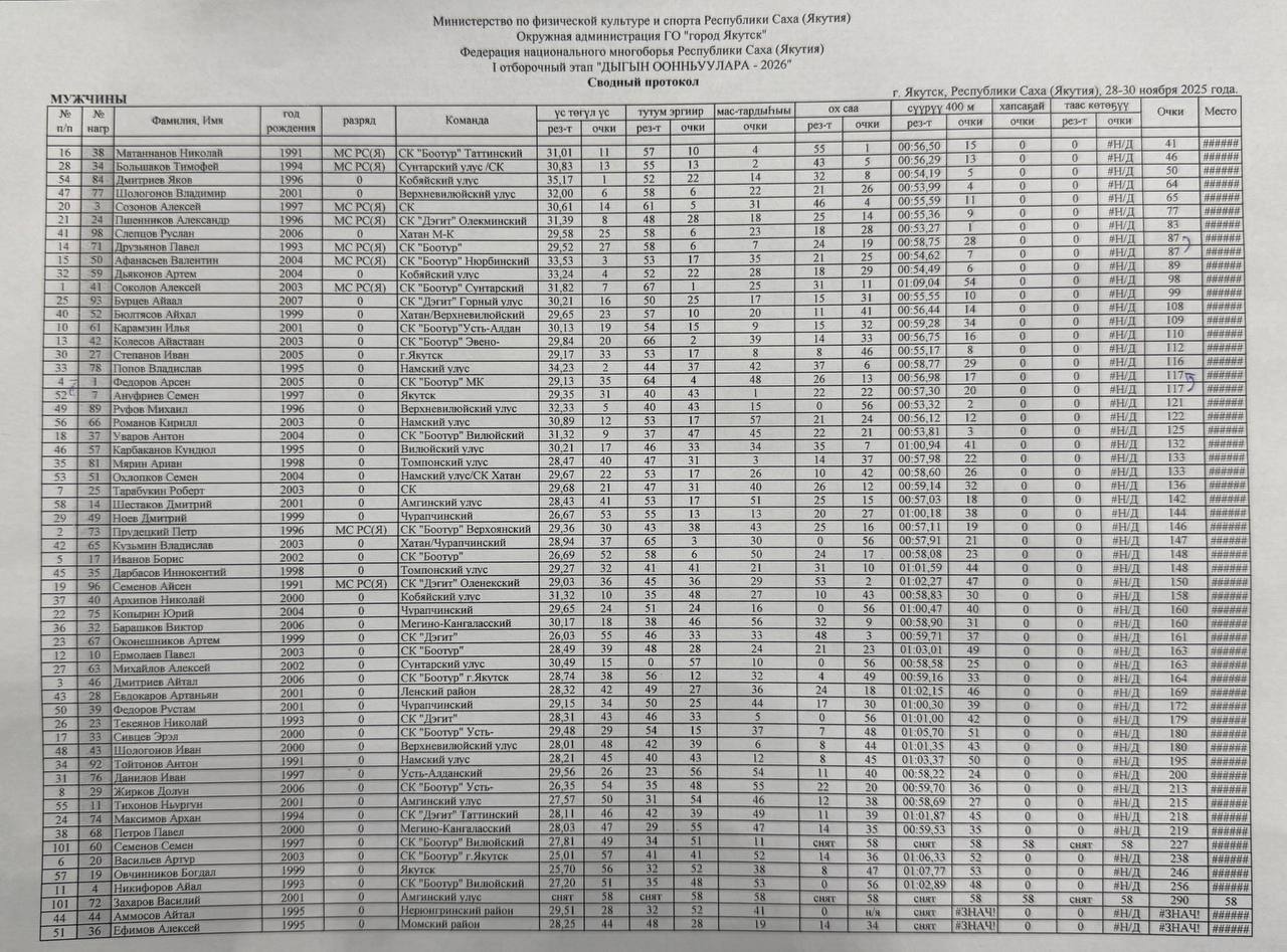 СВОДНЫЙ ПРОТОКОЛ ПОСЛЕ 5 ВИДОВ | ОТБОР НА ИГРЫ ДЫГЫНА-2026
