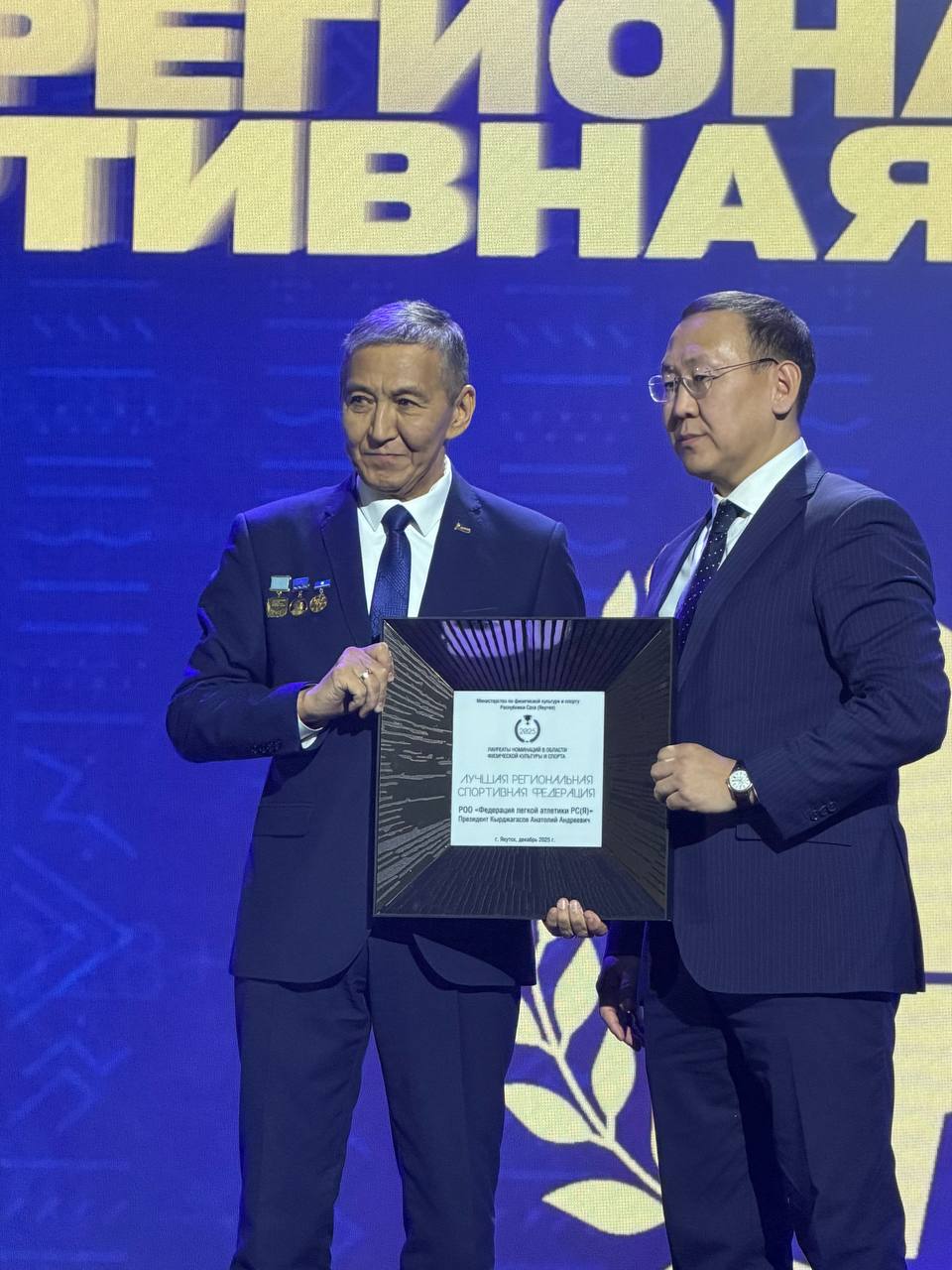 Номинацией «Лучшая региональная спортивная федерация» - отмечаются региональные спортивные федерации, продемонстрировавшие максимальную эффективность в развитии массового спорта, активном привлечении граждан к физическим занятиям, организации спортивных мероприятий и акциях, направленных на улучшение здоровья и формирование устойчивого интереса к спорту среди населения.Обладателем премии в номинации «Лучшая региональная спортивная федерация» 2025 года становится - Региональная общественная организация «Федерация легкой атлетики РС(Я)». Председатель Анатолий Андреевич КЫРДЖАГАСОВ. В этом году федерацией проведено 22 крупных соревнований с большим охватом участников, таких как, марафон «Полюс холода», «Забег Победы», «Якутский полумарафон», «Марафон Олонхо», забег «Игры Манчаары», «Чемпионат России».