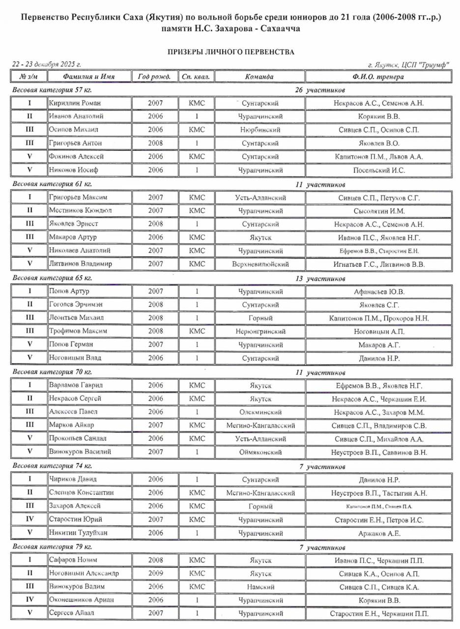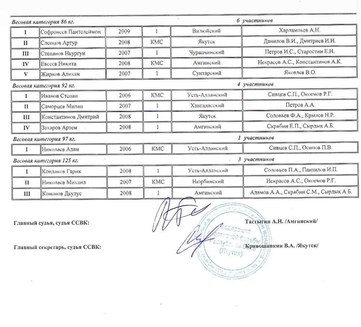 По итогам соревнований Роман Кириллин (57 кг), Максим Григорьев (61 кг), Артур Попов (65 кг) и Гаврил Варламов (70 кг) отмечены специальными призами за хорошую борьбу от спонсоров: торговый дом «Барс», компания «Окна-стандарт» и администрации Амгинского улуса