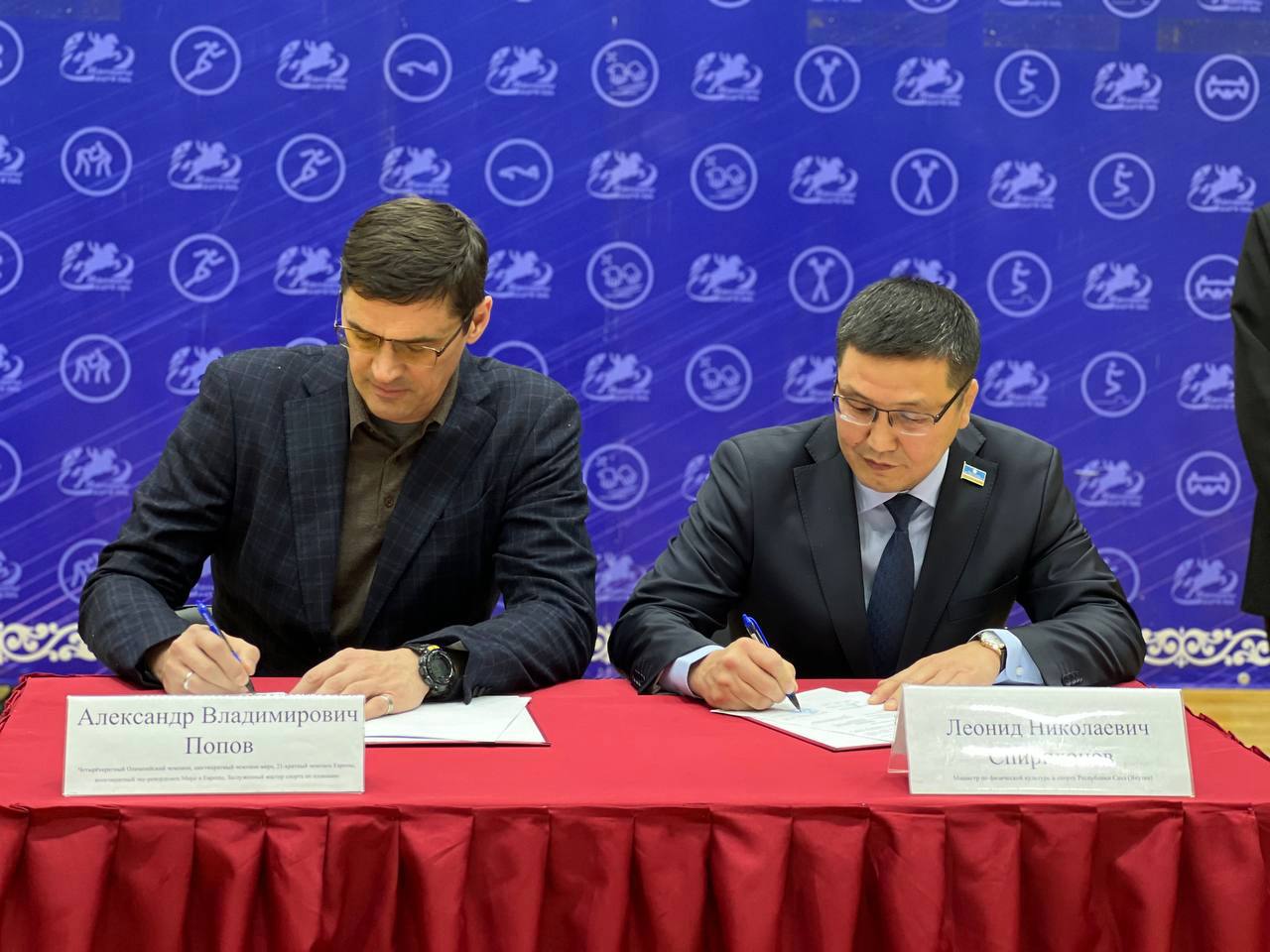 Сегодня во время встречи воспитанников школы плавания Чолбон и любителей водного спорта состоялось торжественное подписание соглашения о сотрудничестве между Общероссийской организацией плавания, водного поло, синхронного плавания и прыжков в воду Федерация водных видов спорта в лице Александра Попова и Министерством по физической культуре и спорту Республики Саха (Якутия) в лице министра Леонида Спиридонова.
