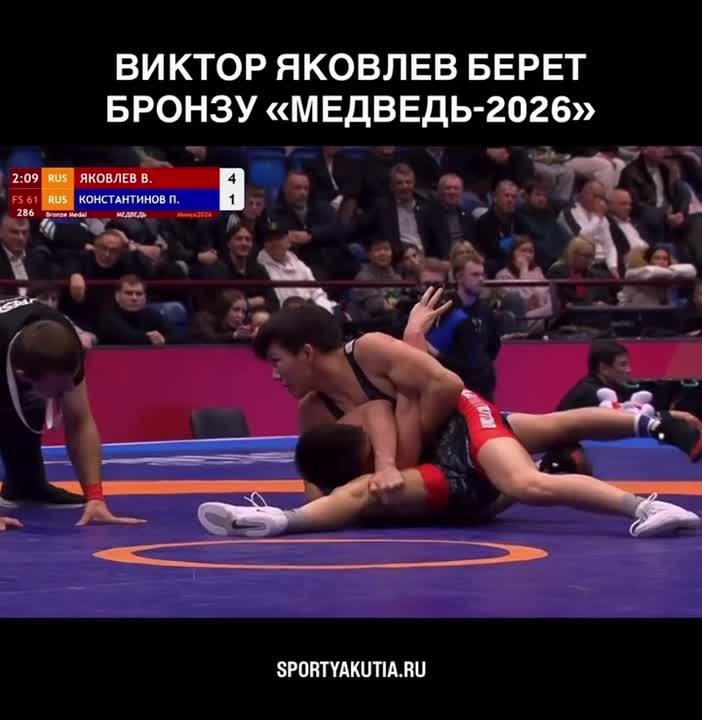 Малый финал двух якутских борцов Виктора Яковлева и Петра Константинова за бронзовую медаль в весе до 61 кг международного турнира «Медведь-2026» завершается победой жиганца на туше!