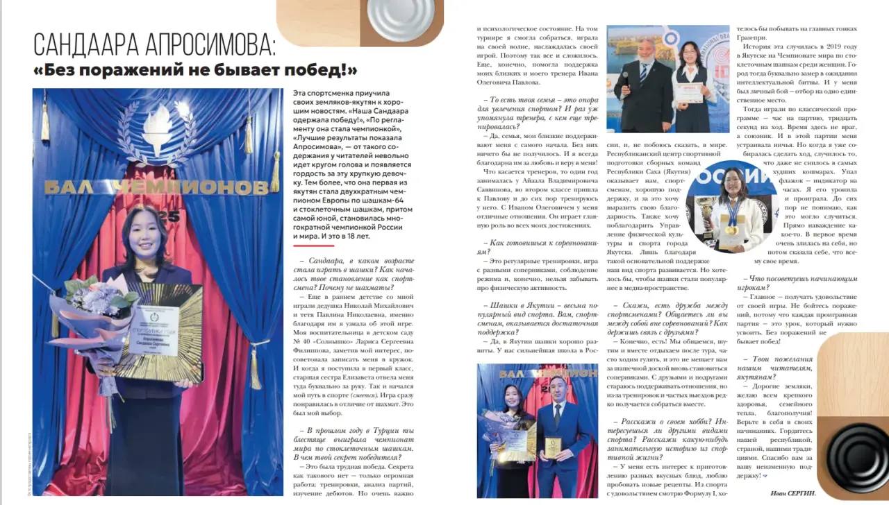 В свежем номере бортового журнала авиакомпании «Якутия» (февраль-март) читайте историю успеха Сандаары Апросимовой, двукратной чемпионки Европы, многократной чемпионкой России и мира по шашкам