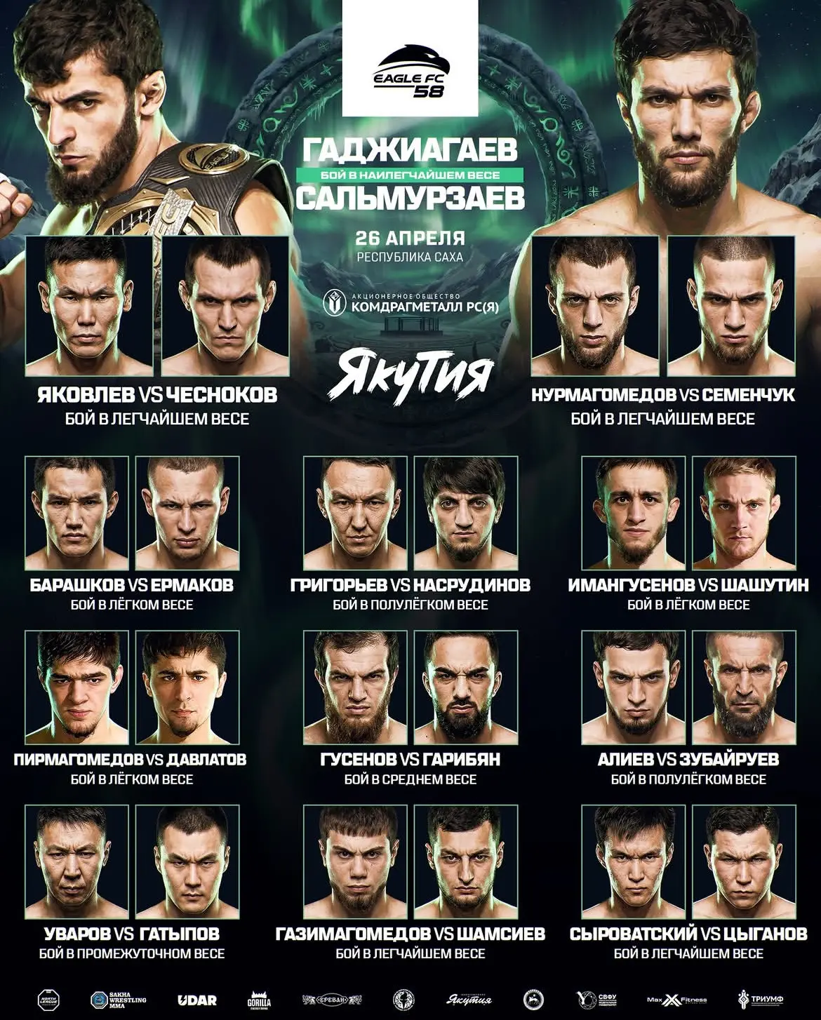 В основном карде за престижный Кубок Ил Дархана сойдутся сильнейшие спортсмены. Хозяина октагона, якутского бойца Октябрина Яковлева, ждет поединок с Виталием Чесноковым из Краснодара. А в одном из ключевых противостояний вечера другой представитель республики, Григорий Барашков, встретится с Василием Ермаковым из Алтайского края. Всего организаторы подготовили 12 бескомпромиссных боев.