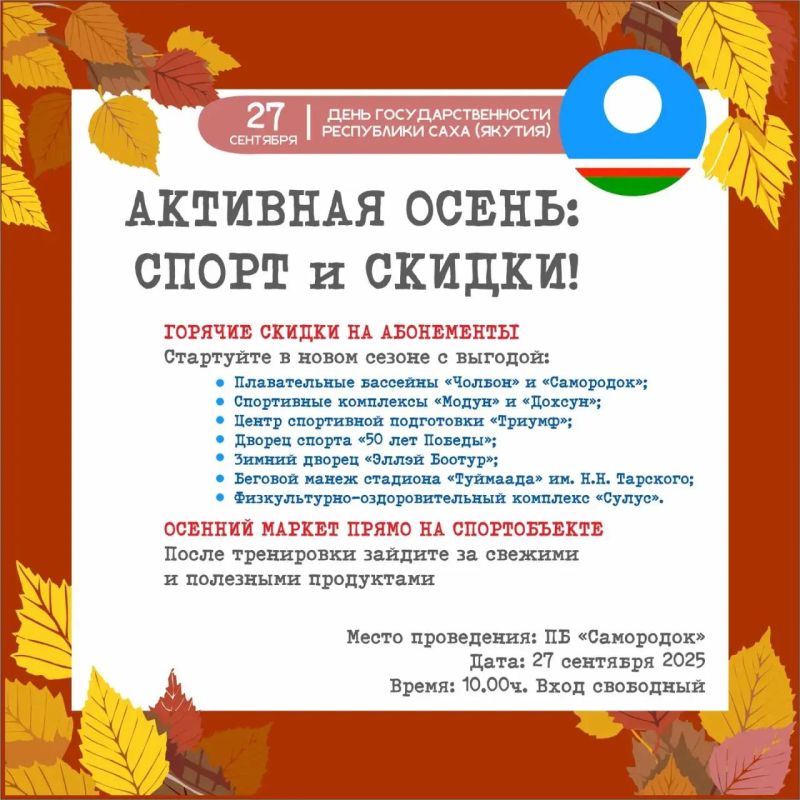 27 сентября, в День государственности Республики Саха (Якутия), в малом спортивном зале плавательного бассейна «Самородок» пройдет благотворительная осенняя ярмарка работников сферы спорта.Гостей ждет широкий выбор:домашние...