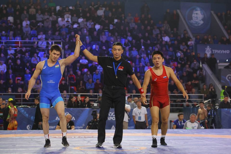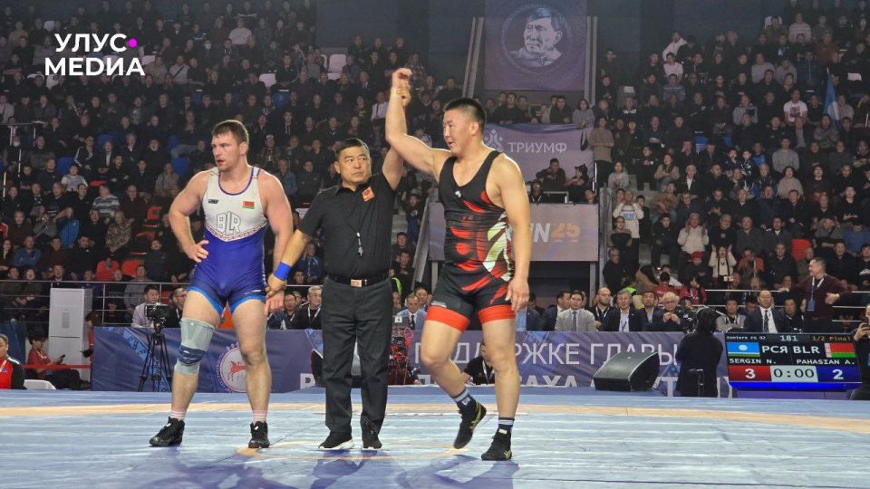 Борец сборной Саха Ньургун Сергин одержал победу над борцом сборной Беларуси Аркадием Погосяном в весовой категории 92 кг@ulusmediasport
