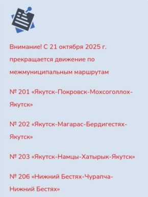 Министр транспорта Сивцев Владимир направил главам районов уведомление о прекращении с 21 октября автобусных рейсов по межмуниципальным маршрутам «Якутск- Покровск – Мохсоголох», «Якутск – Бердигестях», «Якутск – Намцы – Хатырык», «Нижний Бестях –...